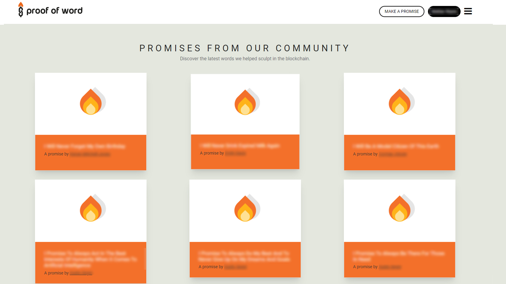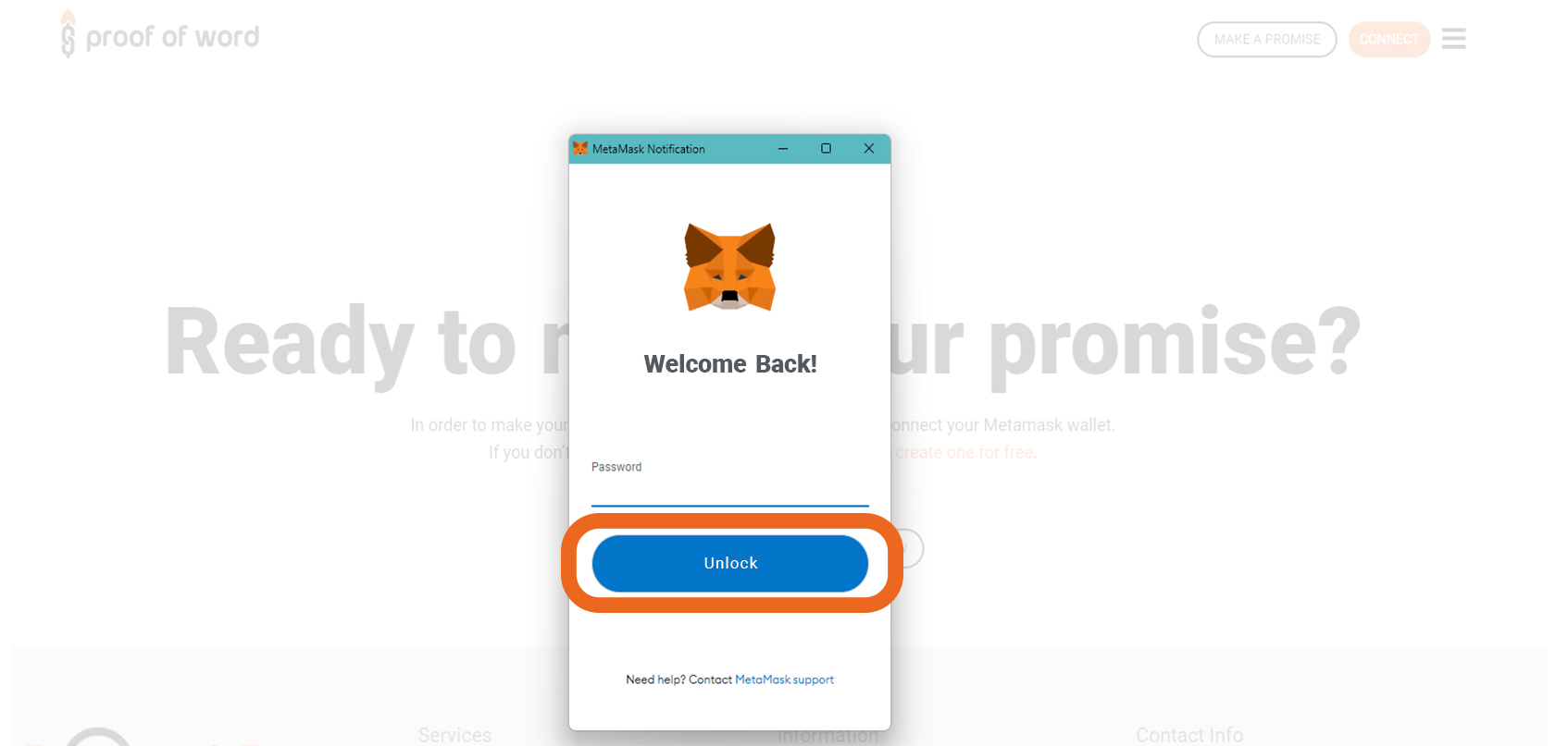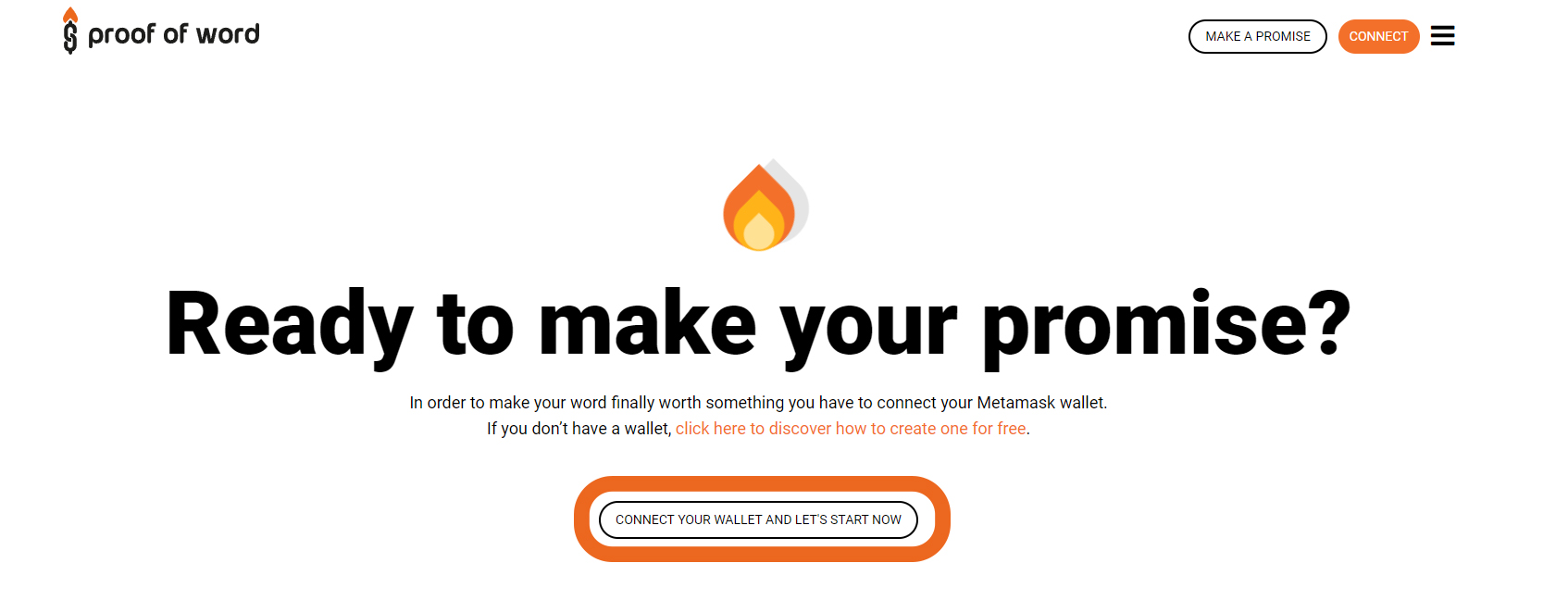 Once you have your Metamask wallet ready - click on MAKE A PROMISE in any part of the website and you will be able to create your promise and your account by connecting your wallet.
