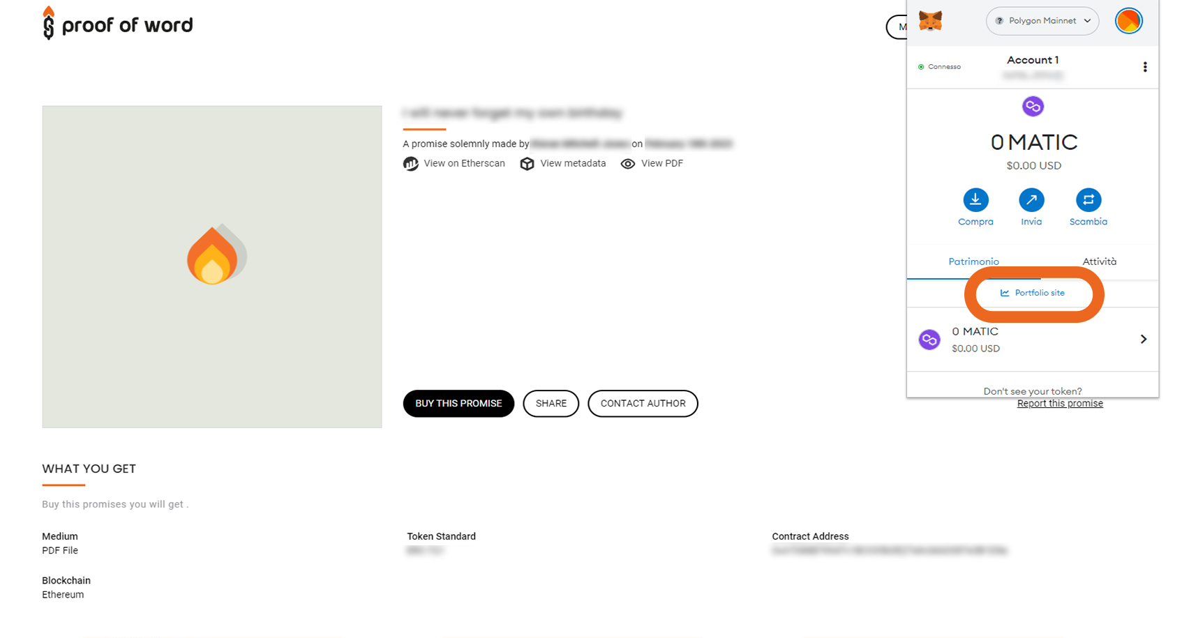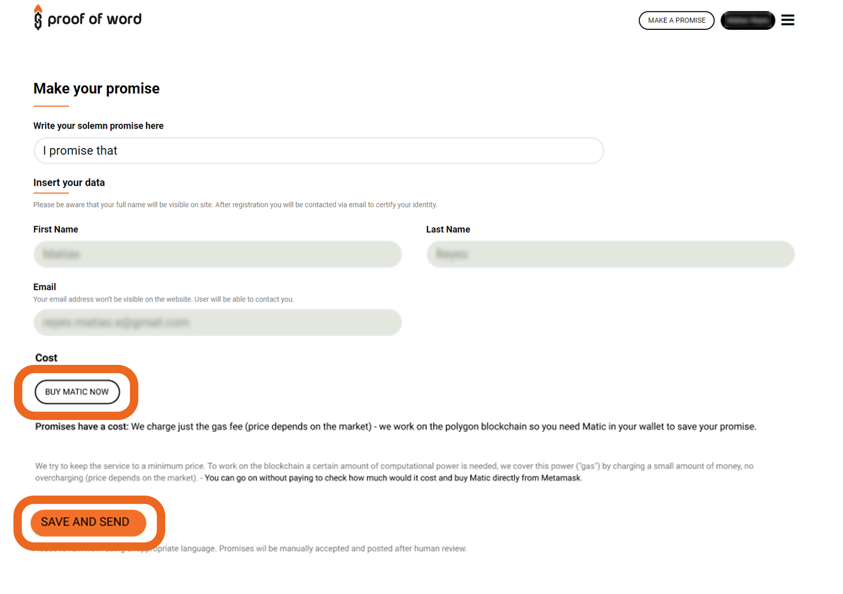 Promises have a cost: We try to keep the service to a minimum price. To work on the blockchain a certain amount of computational power is needed, we cover this power ("gas") by charging a small amount of money (price depends on the market - just the amount of the gas, no overcharging).You can buy Matic by clicking BUY MATIC NOW in the promise page or by clicking on the button below.We work on the polygon blockchain, so you need Matic to cover the gas fee. -